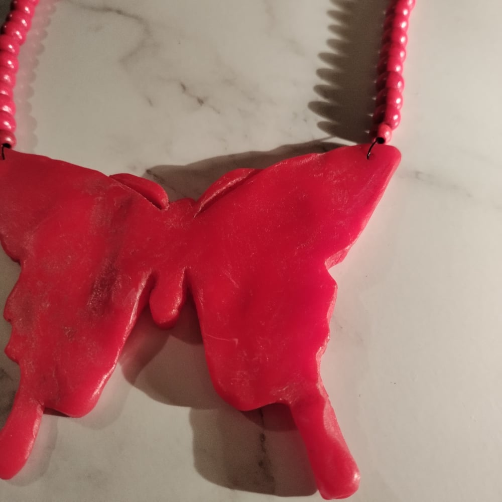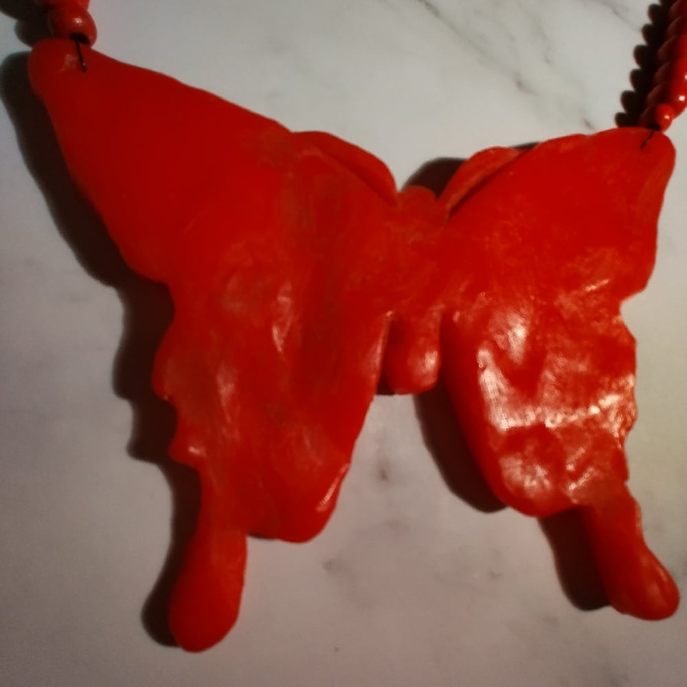 Made with fire engine red-coloured hand-cast resin and set with red wooden beads and chrome hardware.
